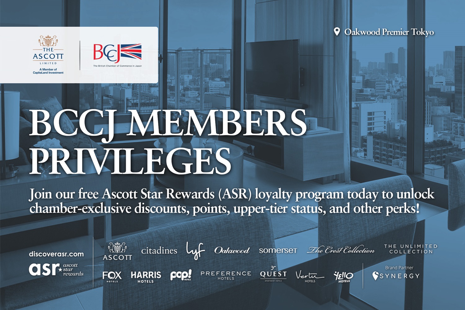 As a proud member of the British Chamber of Commerce in Japan (BCCJ), The Ascott Limited is delighted to offer exclusive benefits to its fellow members.