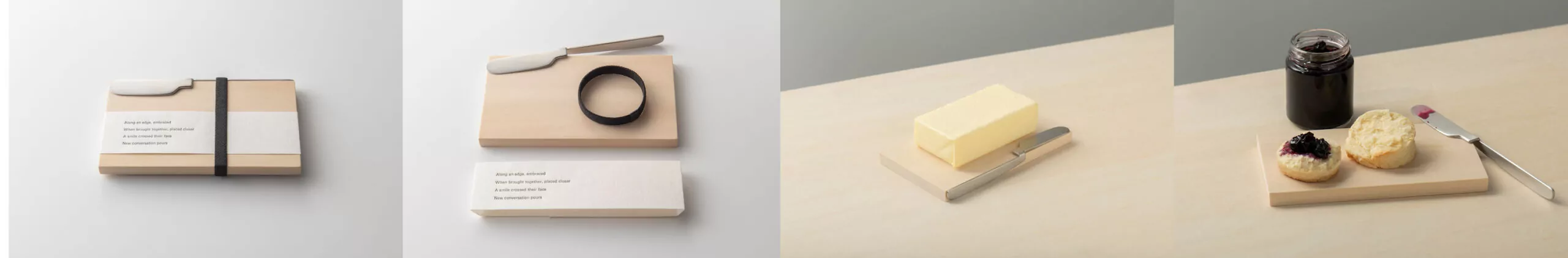 Meaning “to put” and inspired by chopstick rests, Oku features a knife with a unique handle folded at 90 degrees, which allows it to sit on the accompanying wooden board, a plate or its side, without its blade resting on the table. All the elements of the work were created in partnership with Japanese artists: the steel was forged in Tsubame-Sanjo, the ginko wood was sourced from forests in Japan and the paper for the packaging was made by a washi artisan.