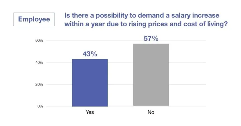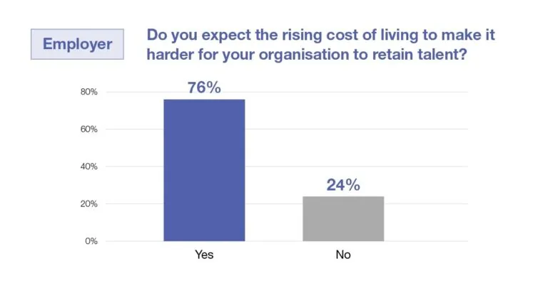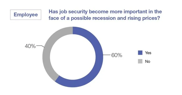 60% of respondents also said that they had become more concerned about job security in the face of a possible recession and rising prices, suggesting that company employees are more concerned about job stability. On the other hand, 76% of companies said that rising prices and cost of living would make it more difficult for their organisation to retain staff.