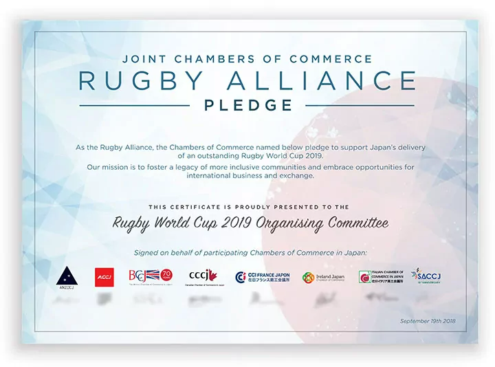 Representing 10 of the 19 nations that will be playing in the Rugby World Cup 2019, The Rugby Alliance is comprised of the following Chambers of Commerce in Japan.