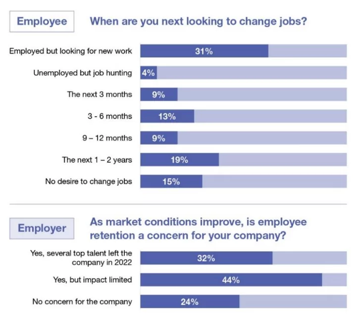 76% of companies surveyed recognize that retention remains a concern among employees and this reflects in the strong trend for professionals surveyed who say they are looking for a career change in the near future. 66% of professionals surveyed say they plan to change jobs by the end of 2023, with 30% already looking for a new opportunity to move jobs.