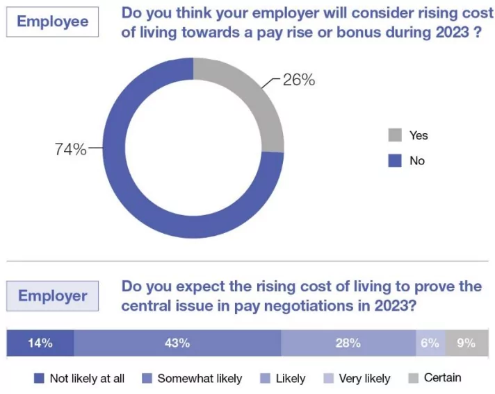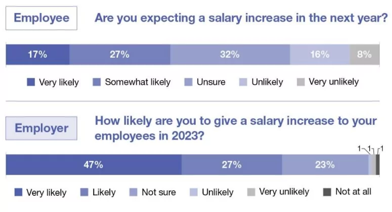 Among companies surveyed, 74% said they are likely to give salary increases during 2023 whereas only 44% of employees expect to get a pay rise during the same period. This is likely an indication that employees still “consider the impact of COVID-19 on companies” (the top reason at 19% for employees when asked why they would not negotiate a salary increase) as we move into a postpandemic time, whereas the reality is that companies say they are in the position to discuss giving a salary increase during 2023. Other reasons for the low expectation for a salary increase from professionals surveyed include “not jeopardizing job security (16%)” and “not sure how to do so (15%)”. revealing there is a need for better communication from employers to their employees to ensure salary expectations are more aligned.