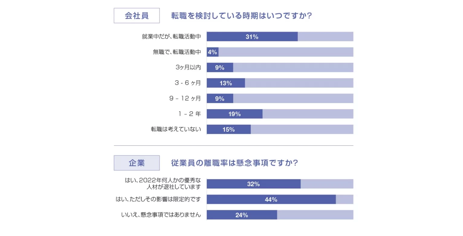 66%の会社員が、1年以内に転職を検討していると回答しました。また、そのうちの約半数はすでに新しい転職先を見据え転職活動を始めていることが分かりました。一方、回答企業の76%が、従業員の離職・定着率が懸念事項であると認識しています。