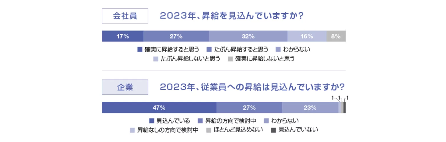 2022年12月に総務省が1981年以降で最も高い消費者物価指数の上昇率を示すデータを発表したことから、会社員は、物価上昇が給与に及ぼす影響を懸念しています。しかし、74%の会社員は、企業側が物価上昇を昇給やボーナスに反映させるとは考えていないようです。これとは対照的に、企業に逆の質問をしたところ、企業の85%が、給与交渉の際に物価の上昇は影響してくると考えています。