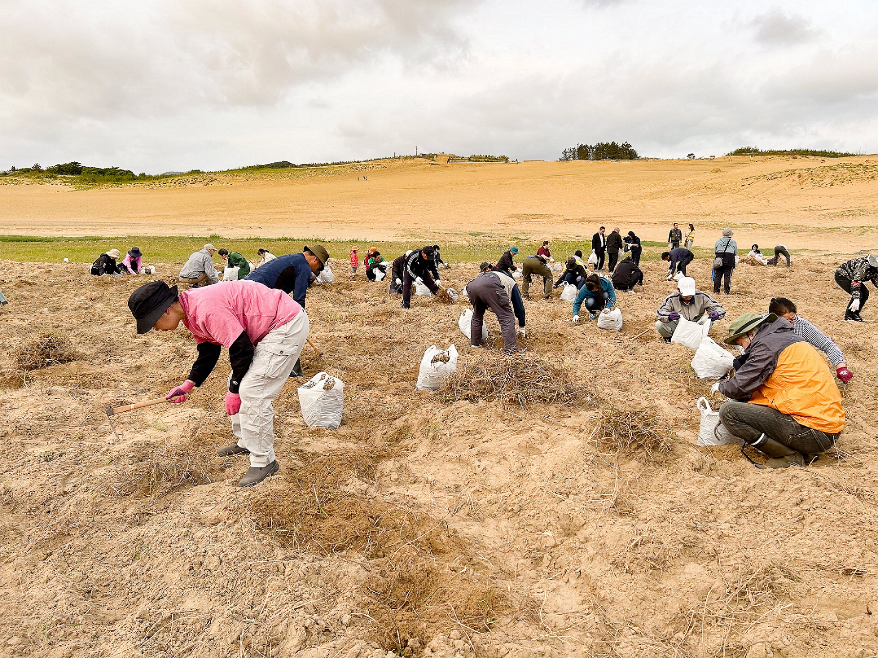 Tottori has launched a series of weeding events as part of a long-term plan to rid its sand dunes of invasive plants. The Tottori Sand Dunes Mirai Council estimates that 20–30% of the dunes have been overrun by non-native vegetation in the past 20 years. The encroachment disrupts natural sand flow patterns, leading to the formation of mounds that cause erosion and native biodiversity loss while hindering the expansion of activities. Longer term, these mounds could destabilize the dune system, threatening its survival.